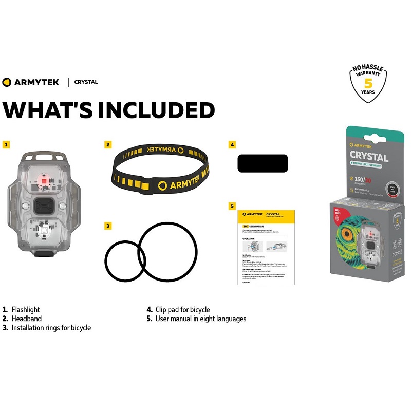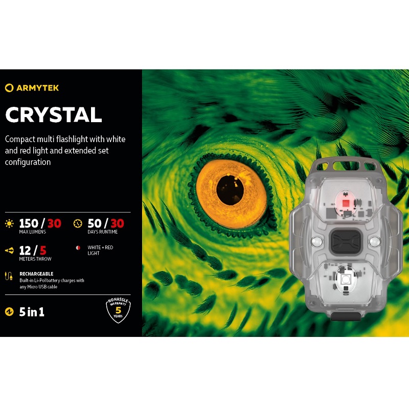 Crystal je multifunkčný model s jasným červeným svetlom až 30 lúmenov a bielym svetlom až 150 lúmenov, ktorý sa ľahko zmestí do vrecka. Vďaka plne svietiacemu telu a 140° širokému záberu je baterka nepostrádateľná pre každodenné použitie na blízko: na jogging, cyklistiku alebo práce v garáži. Červené svetlo modelu Crystal je vhodné na vykonávanie prác v tme a na udržanie nočného videnia pri zapínaní a vypínaní baterky: v kempingovom stane, pri pozorovaní hviezd, pri rybolove alebo bicyklovaní. Má tiež ďalšiu výhodu pre outdoorové aktivity - umožňuje osvetliť oblasť bez priťahovania otravného hmyzu. Baterka funguje až 50 dní v režime minimálneho jasu. Nie je potrebné dodatočne dokupovať a neustále meniť batérie: vstavaná Li-Pol batéria sa nabíja pomocou akéhokoľvek Micro USB kábla. Multifunkčná baterka nezaberie veľa miesta v batohu alebo taške a uvoľní ho na iné veci. Model je na hlave bezpečne pripevnený gumičkou, čo umožňuje dobré osvetlenie pri akejkoľvek aktivite. Baterku je možné pripevniť na akúkoľvek časť oblečenia, opasok alebo popruh batohu pre bezpečnú nočnú turistiku. Pomocou špeciálnych silikónových krúžkov v sade je Crystal bezpečne nainštalovaný na bicykli. Navyše dizajn tela s otvorom pre prívesok na kľúče umožňuje použitie multi baterky ako štýlového doplnku.