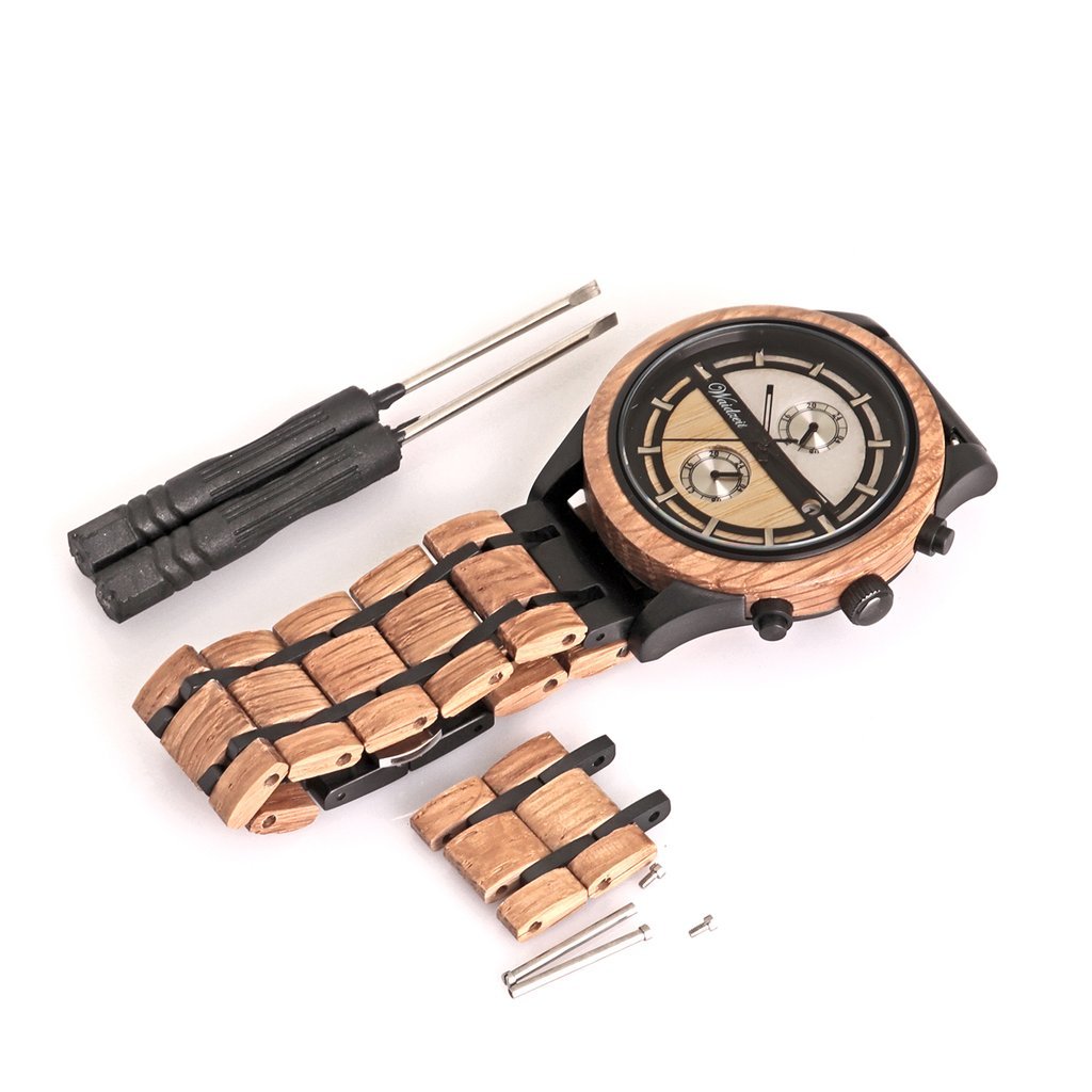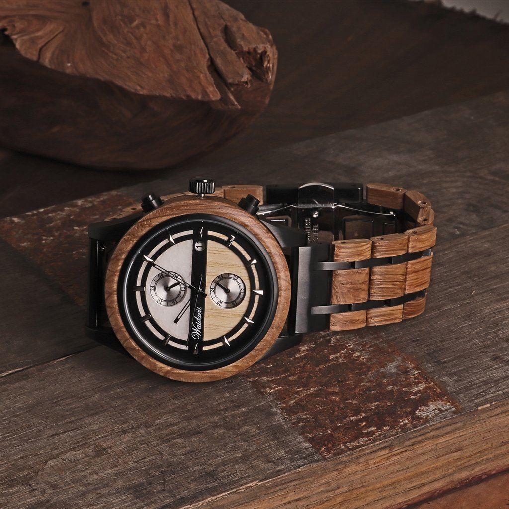 Materiál : dubové drevo, mramor, jaseň Rozmery: 45 mm Pohon: strojček (2 roky záruky na pohyb) Batéria: dodávané s batériou Pohlavie: pánske Záruka: 24 mesiacov Šírka remienka: 22 mm Kvalitné balenie: v cene Ciferník: chronograf Farba ciferníku: biela Tvar hodiniek: okrúhly Sklíčko: zafírové sklo Remienok: drevené Farba remienka: hnedá