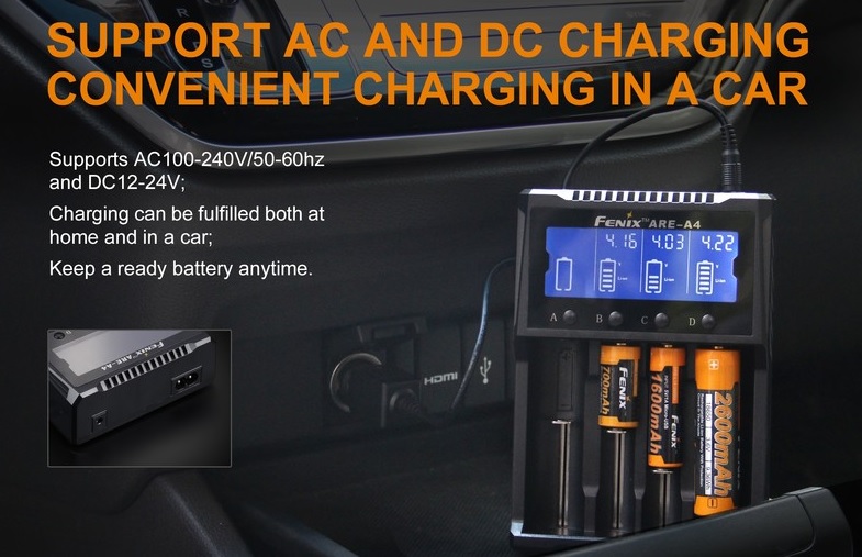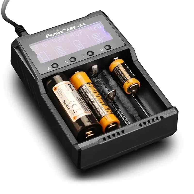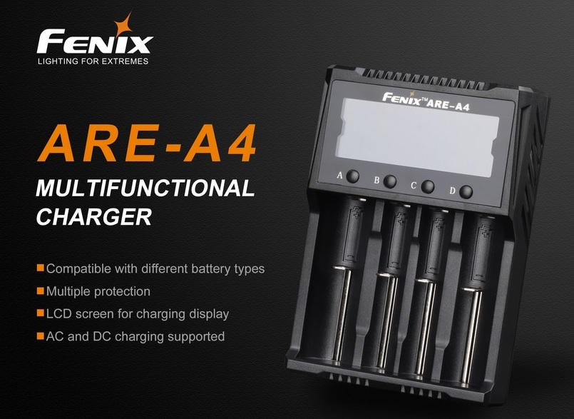 Univerzálna štvorkanálová nabíjačka Fenix ARE-A4 je určená pre 3,7V / 3,6V Li-ion i NiMH / NiCd akumulátory. Každý nabíjací slot je monitorovaný nezávisle, takže je možné naraz nabíjať batérie rôznych veľkostí, kapacít a dokonca aj rôznych materiálov (Li-ion i NiMH / NiCd je možné nabíjať naraz). Automaticky rozpozná vložený typ akumulátora a zvolí optimálny nabíjací algoritmus.
