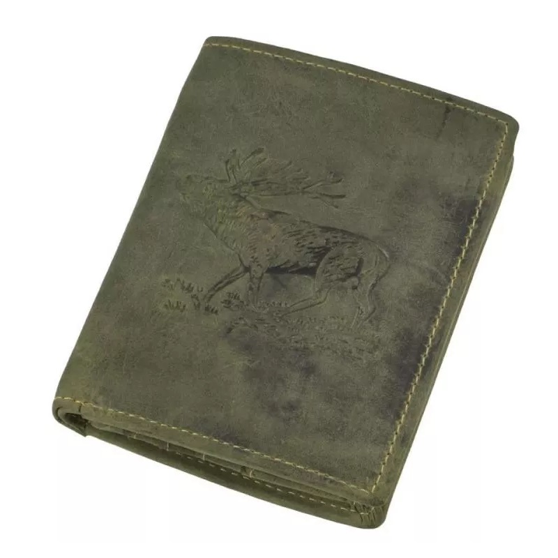 Pánska peňaženka z kvalitnej brúsenej kože Greenburry 9,5x12cm s razbou jeleňa. Ručná výroba. Farba zelená.