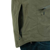 Veľký počet vreciek chráni veci poľovníka vďaka vodeodolným zipsom. V chladnejších teplotách vrecká na hrudi s hrejivou podšívkou udržia vaše ruky v teple. Na zadnej strane je tiež vrecko. Odnímateľná kapucňa.