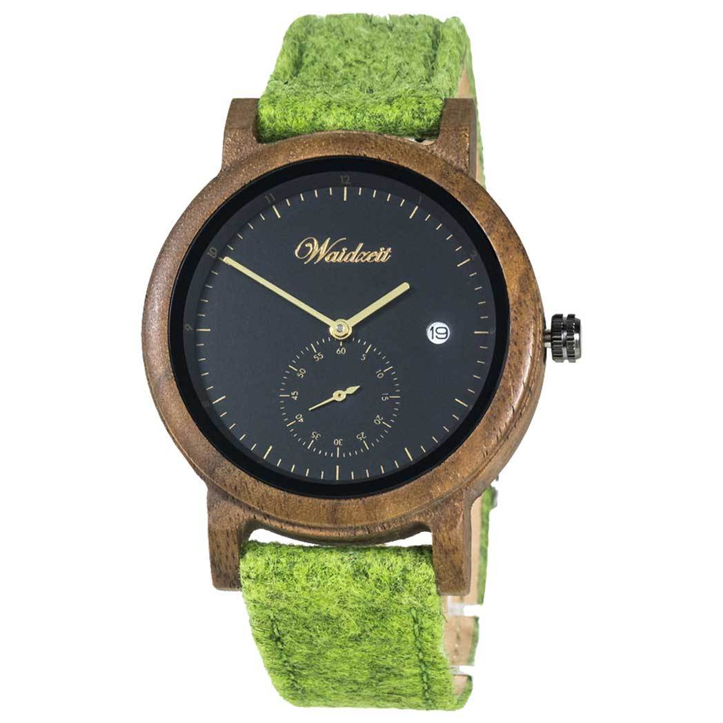 Materiál: orechové drevo, lodén Rozmery: 42 mm Pohon: Japonský quartzový strojček Miyota (2 roky záruka na pohyb) Batéria: dodávané s batériou Pohlavie: pánske Záruka: 24 mesiacov Šírka remienka: 20 mm Kvalitné balenie: v cene Ciferník: analógový, zobrazujú dátum Farba ciferníku: zlatá, čierna Tvar hodiniek: okrúhly Sklíčko: minerálne sklo Remienok: lodén Farba remienka: zelená