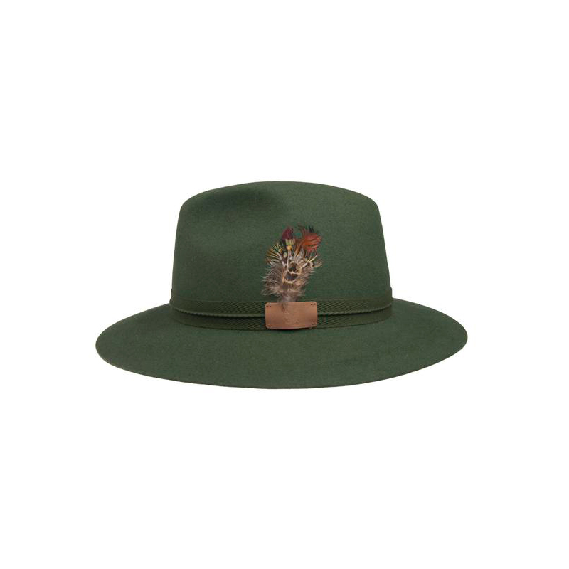 Pánsky poľovnícky klobúk s tkanou stuhou zdobenou kožou s perím, kožený potný pásik.Farba: zelenáZloženie: 100% králičia srsť