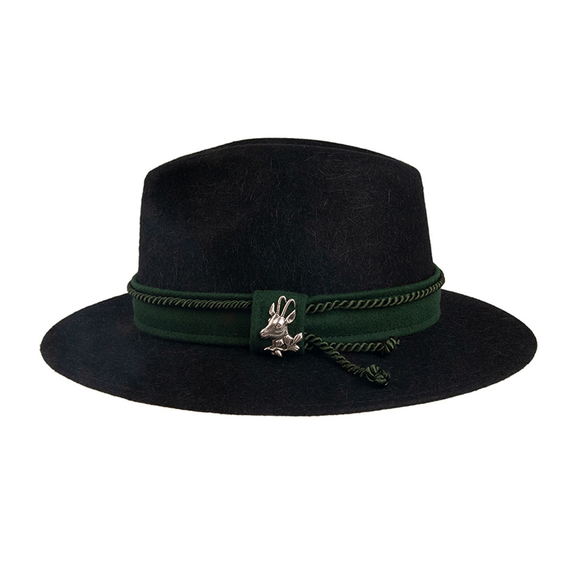 Poľovnícky klobúk zdobený plsteným pásikom, krútenou šnúrou a brošňou. Klobúk je vybavený podšívkou a strečovým potným pásikom. Šírka okraju: 6,5 cm.Farba: čiernaZloženie: 100% králičia srsť