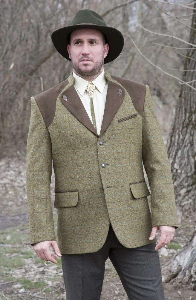 Prvotriedny materiál zelenej farby s hnedým károvaním je doplnený imitáciou kože z hnedého velúru na klopách, ramenách a lemovaní vreciek. Z imitácie kože sú aj záplaty na lakťoch na rukávoch.