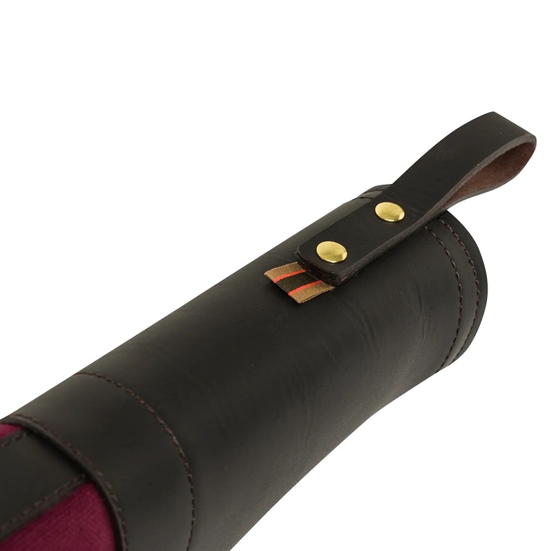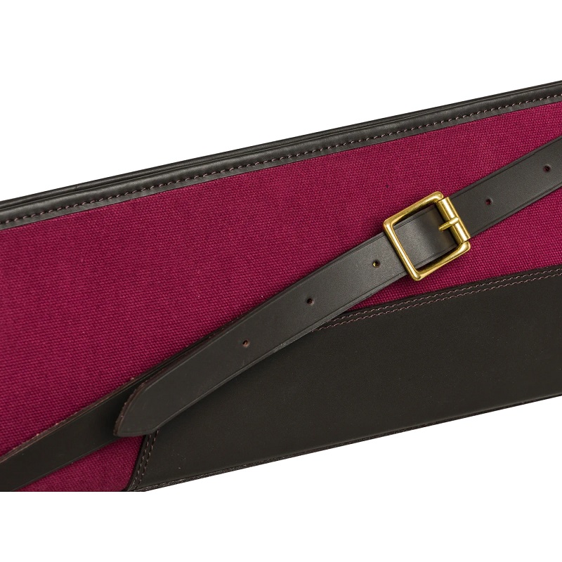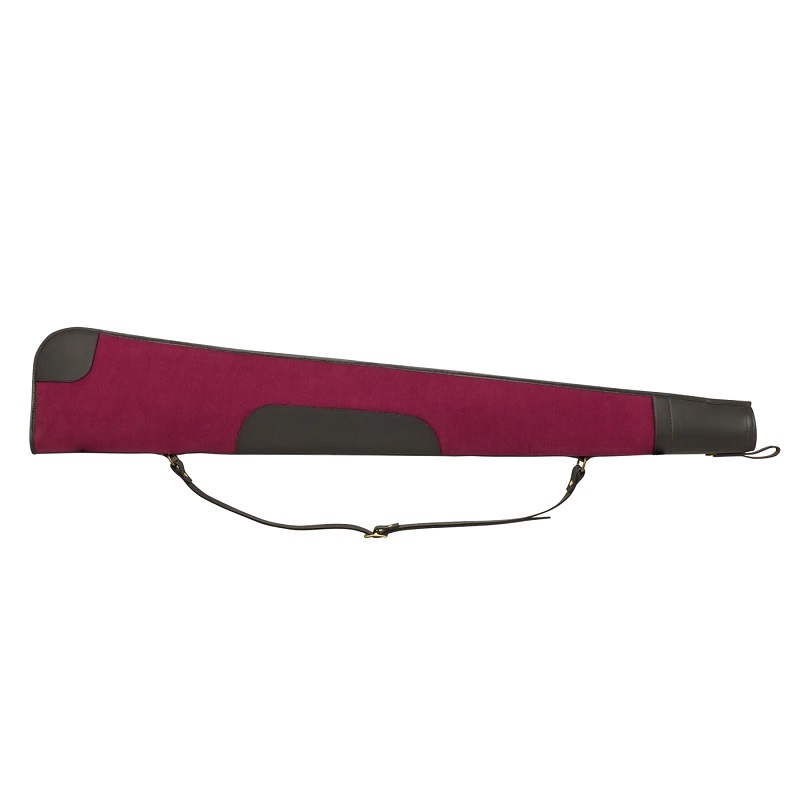Jednoduché puzdro na pušky s hladkým vývrtom vyrobené z bavlneného plátna a panelov z pravej kože. Zapínanie na zips. Vnútorná podšívka z umelej kožušiny bielej farby. Staršie mosadzné doplnky, spony a nity.