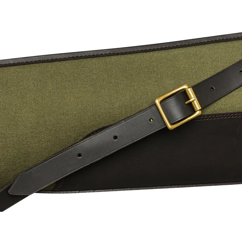 Jednoduché puzdro na pušky s hladkým vývrtom vyrobené z bavlneného plátna a panelov z pravej kože. Zapínanie na zips. Vnútorná podšívka z umelej kožušiny bielej farby. Staršie mosadzné doplnky, spony a nity.