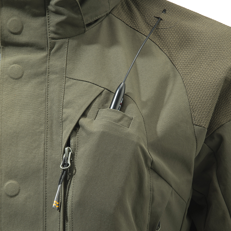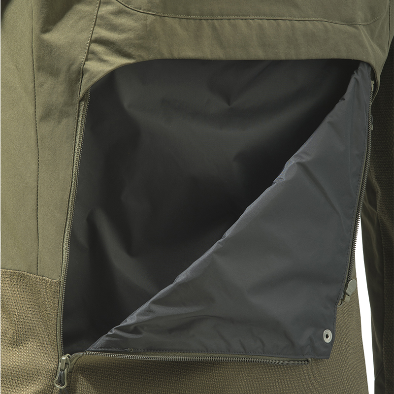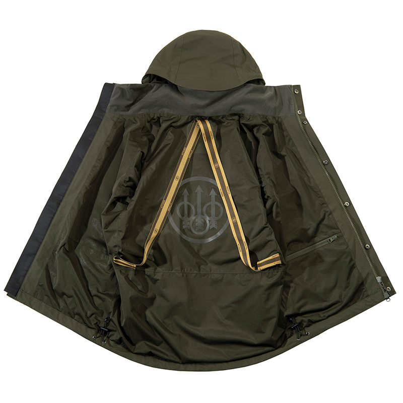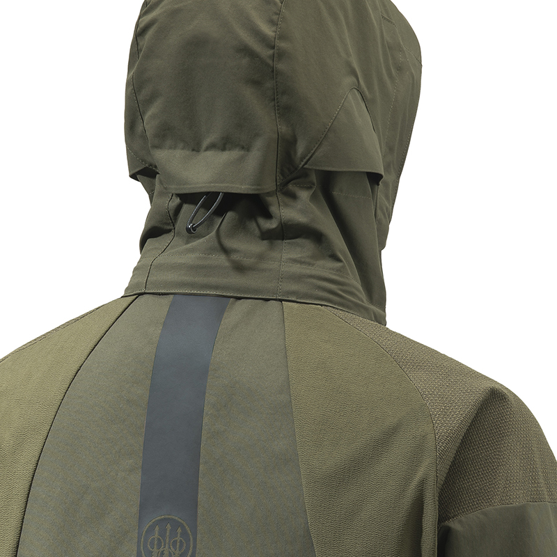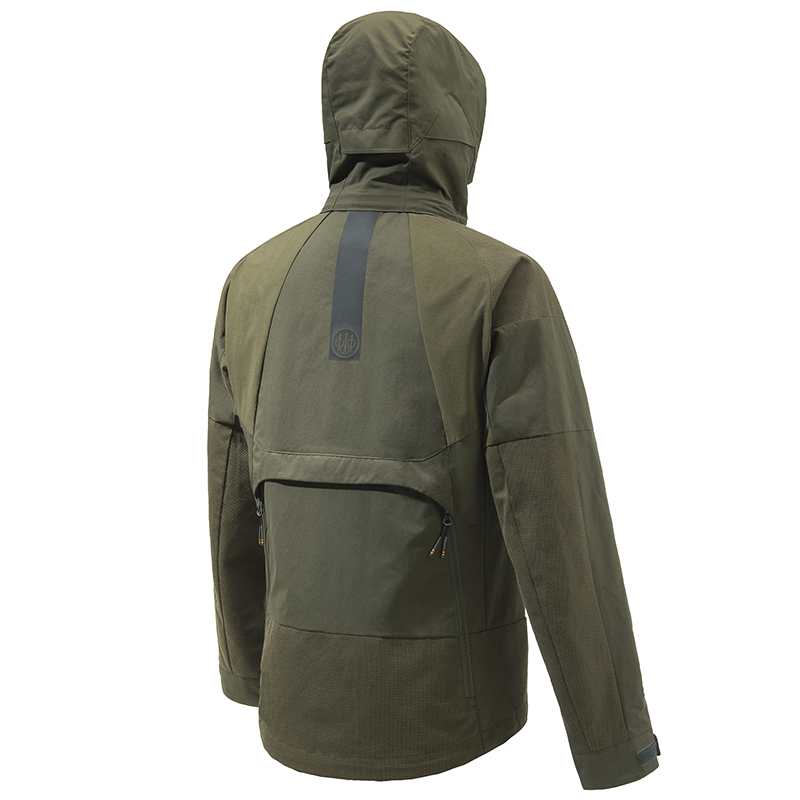Nepremokavá a priedušná vďaka BWB EVO - Beretta Waterproof Breathable EVO membráne - membrána s elastickou podšívkou. Hlavnou tkaninou je vysokopevnostný polyamid s DWR - Durable Water Repellent - úpravou. Vložky odolné voči oderu v kľúčových oblastiach pre zvýšenie životnosti.