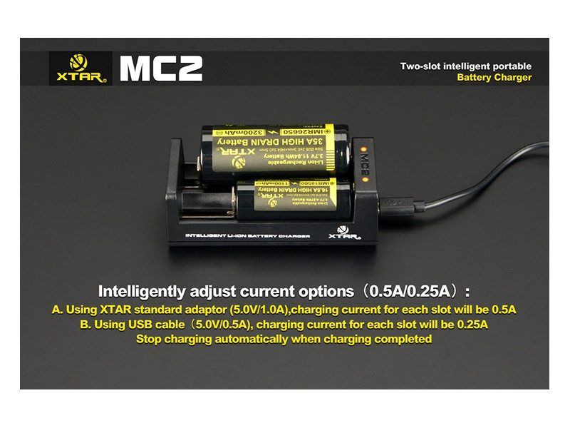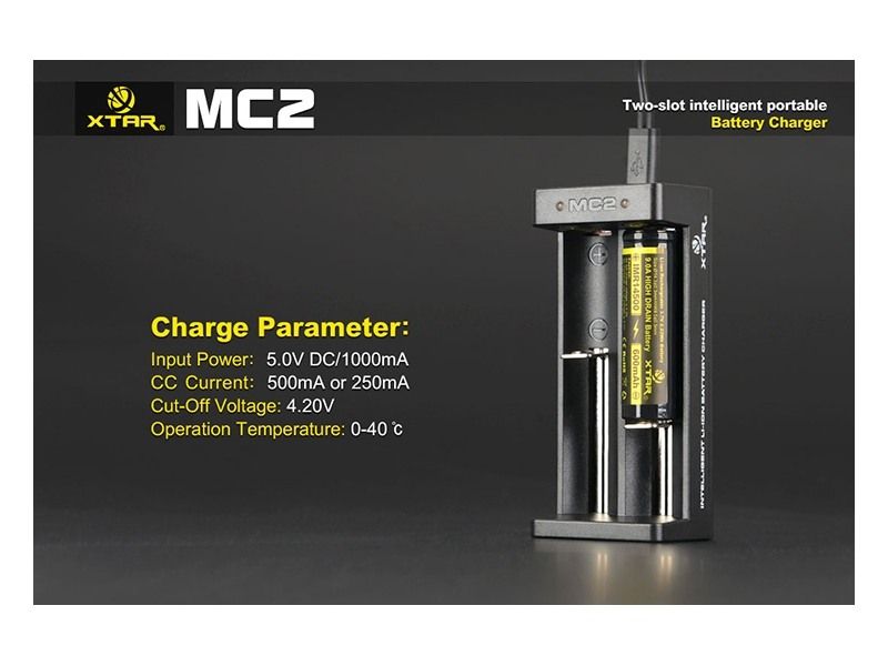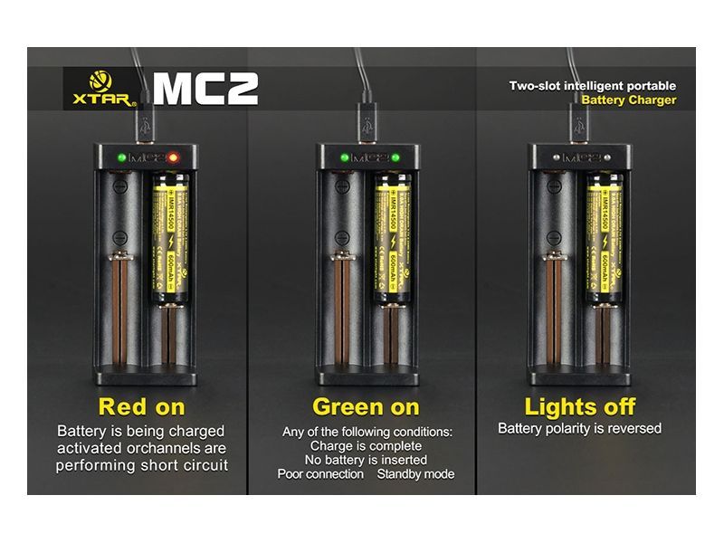 Rýchlonabíjačka MC2 je univerzálna nabíjačka, určená na nabíjanie 14500/14650/16340/17500/17670/18350/18500/18650/18700/ 22650 3.6V/3.7V Li-ion akumulátorov. XTAR MC2 je nabíjačka, ktorá s pomerne nízkou hmotnosťou a ultra-kompaktnou veľkosťou, bola navrhnutá tak, aby bol dosiahnutý veľmi solídný výkon a praktickosť. MC2 zdedila všetky dobré vlastnosti nabíjačiek XTAR. Nabíjačka má 0V aktivačnú funkciu, ktorá prebudí k životu aj veľmi vybité akumulátory. Má ochranu proti prehriatiu, skratu a prepólovaniu. Možnosť nabíjania dvoch batérií súčasne a nezávisle na sebe. Nabíjačka vie intelligentne zistiť príkon a automaticky nastaví vhodný nabíjací prúd (0.25A / 1.0a). Nabíjanie pomocou Algoritmov (TC/CC/CV), ktoré sú najvhodnejšie pre nabíjanie Li-ion akumulátorov. Ďalšou výhodou tejto nabíjačky je to, že nabíja všetky druhy Li-ion akumulátorov aj bez potreby dištančných valčekov a to vďaka pohyblivému mínusovému kontaktu. MC2 používa microUSB port, ktorý je v súčasnosti najpoužívanejší, takže môžete na napájanie nabíjačky používať aj USB kábel z mobilného telefónu a vďaka jej úzkemu tvaru umožňuje nabíjanému akumulátoru dokonalý odvod tepla. Po vložení akumulátoru do nabíjačky sa kontrolka rozsvieti na červeno, akumulátor sa nabíja. Po nabití akumulátora sa kontrolka rozsvieti na zeleno a nabíjanie sa ukončí.